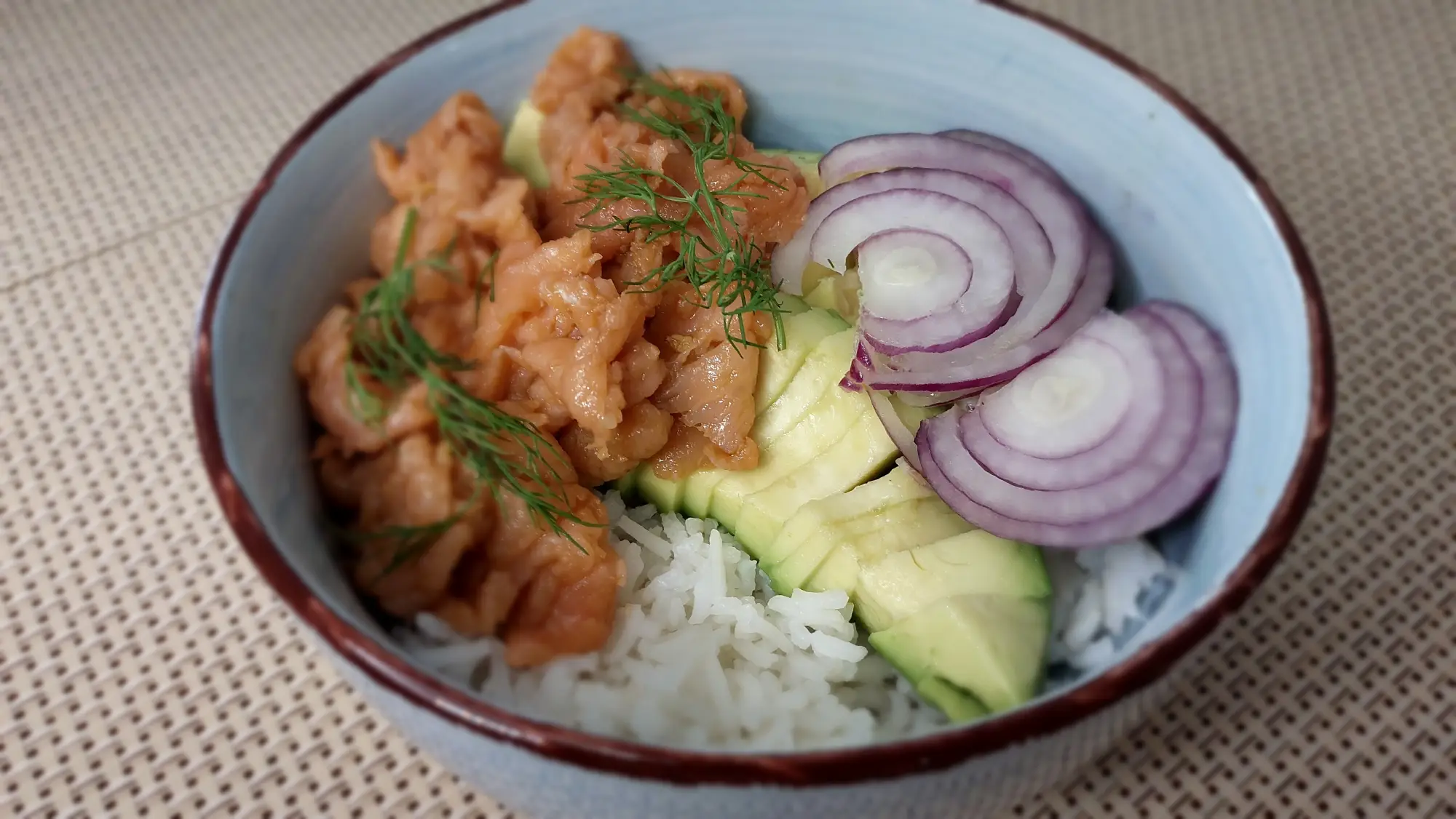 To danie jest bogate w zdrowe tłuszcze, głównie pochodzące z awokado i łososia, które wspierają pracę serca i mózgu. Zawiera także solidną dawkę białka, niezbędnego do budowy i regeneracji mięśni, pochodzącego głównie z łososia oraz produktów mlecznych. Ryż dostarcza energii w postaci węglowodanów, a dodatek błonnika z awokado oraz koperku wspomaga trawienie. Sos sojowy, czosnek i cebula wzbogacają danie o składniki o działaniu przeciwzapalnym, a jogurt z serkiem dodają kremowej konsystencji, jednocześnie dostarczając wapnia dla mocnych kości.