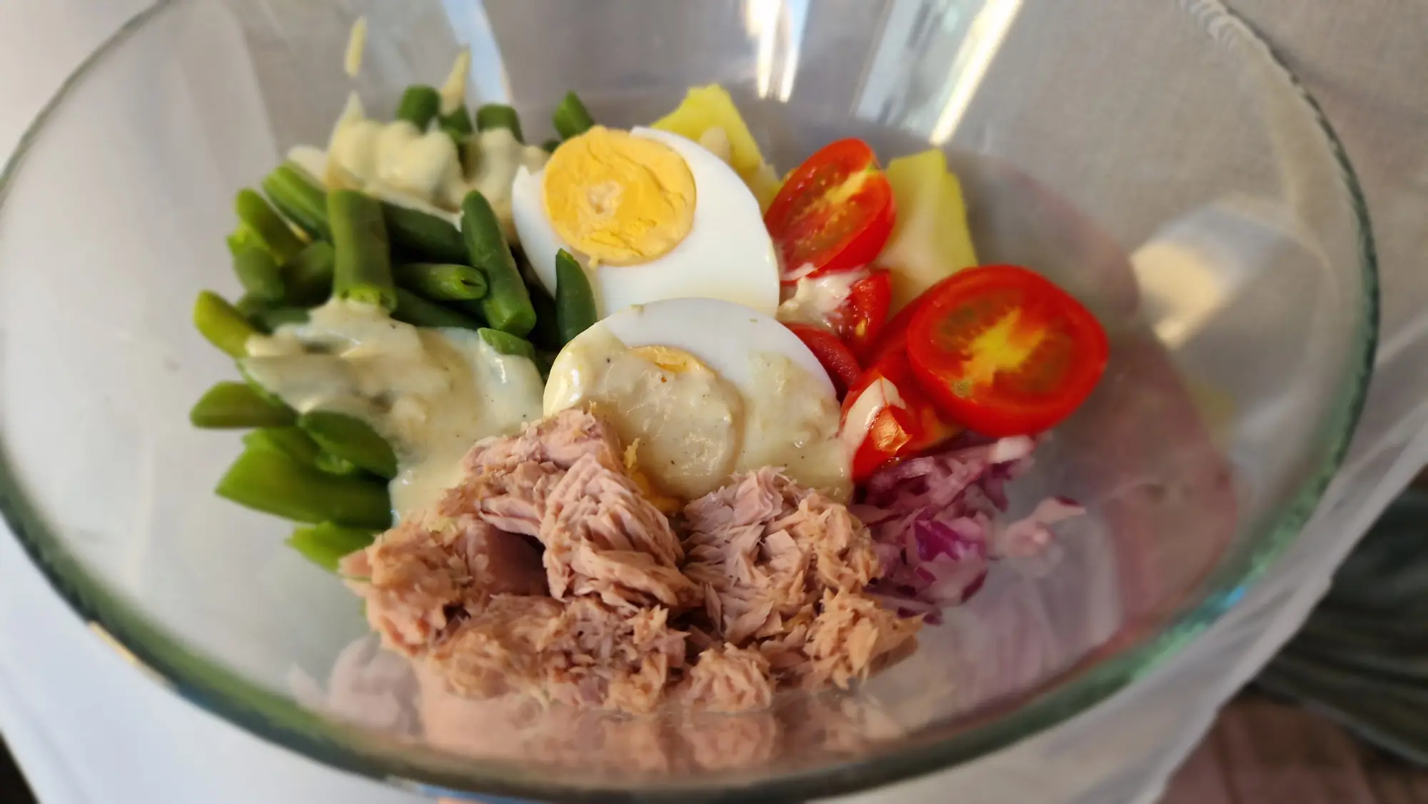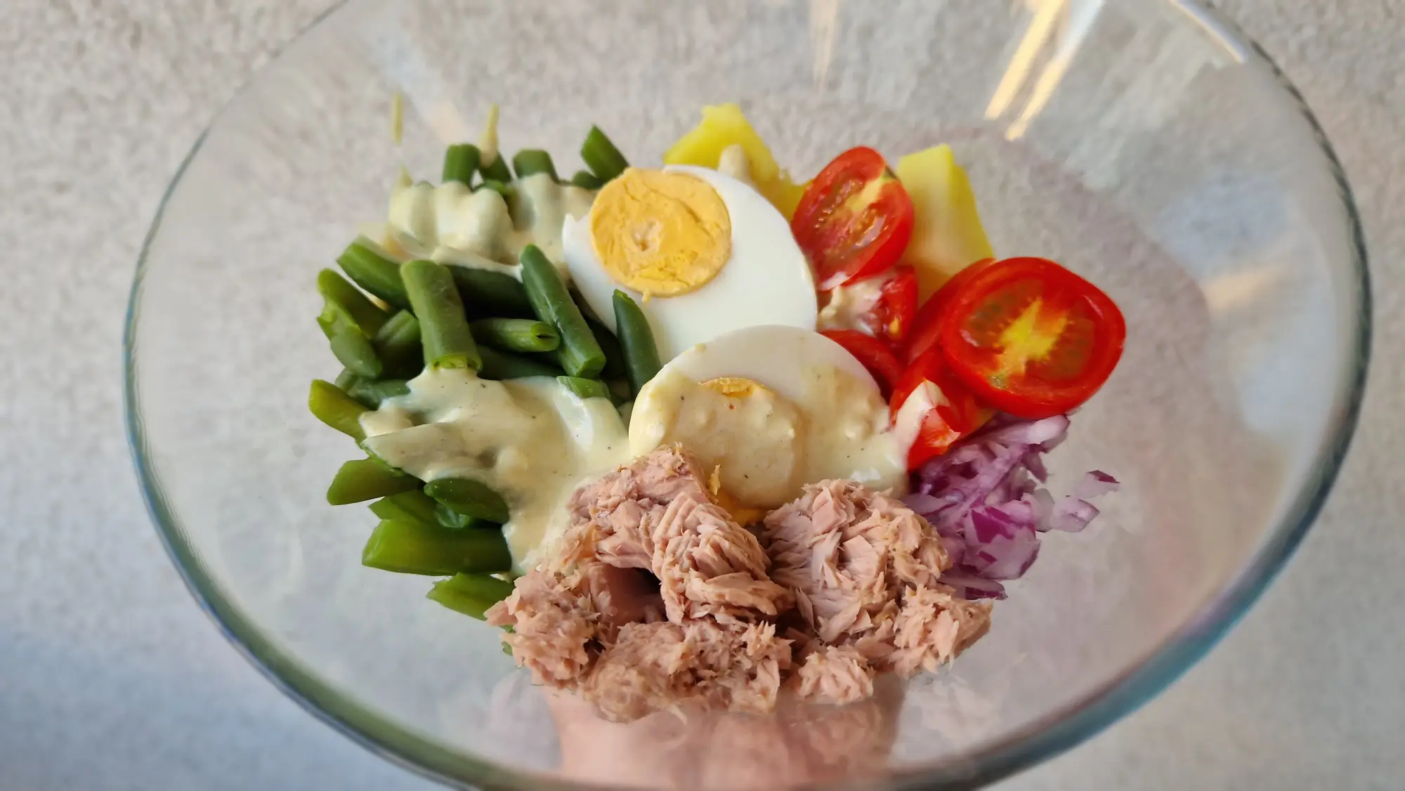To sycące danie z tuńczykiem, jajkiem i warzywami to lekka, pełnowartościowa propozycja idealna na obiad lub kolację. Zawiera solidną porcję niskotłuszczowego białka z tuńczyka i jaj, a dzięki dodatkom takich jak ziemniaki, fasolka szparagowa i pomidorki cherry dostarcza cennych witamin, minerałów i antyoksydantów. Domowy dressing z oliwy i cytryny wspiera zdrowie serca, dostarczając jednonienasyconych kwasów tłuszczowych. Sałatka jest bogata w błonnik, wspomaga trawienie i zapewnia dłuższe uczucie sytości. To szybki, zdrowy posiłek, który świetnie wpisuje się w zbilansowaną dietę i przepisy na fit sałatki.