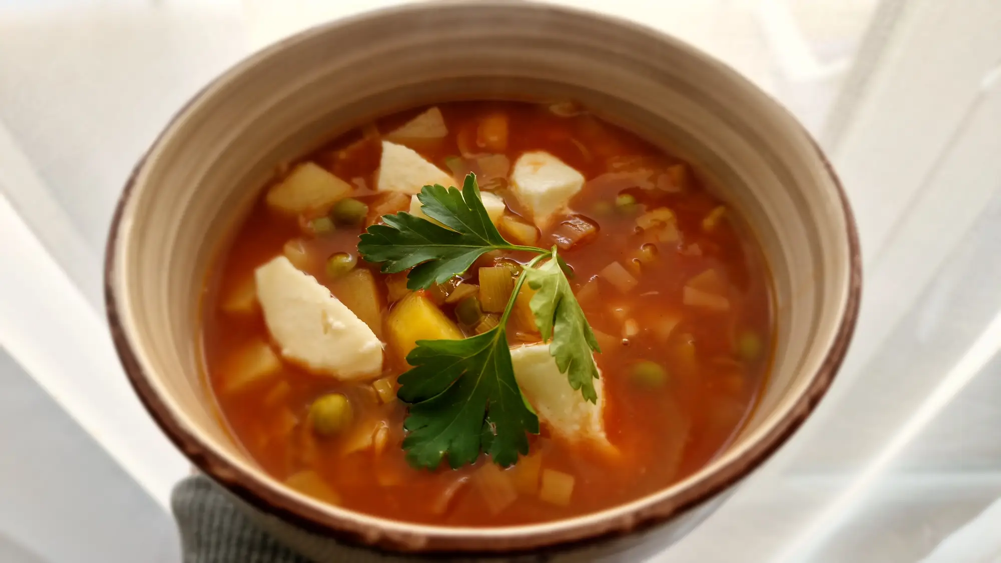 Por i czosnek wspierają odporność oraz działają przeciwzapalnie. Ziemniaki dostarczają energii i są źródłem błonnika, który wspomaga pracę jelit. Groszek konserwowy wnosi porcję białka roślinnego i witamin, a passata pomidorowa obfituje w likopen – silny przeciwutleniacz wspierający serce i skórę. Oliwa dostarcza zdrowych tłuszczów, a mozzarella wzbogaca zupę w wapń, niezbędny dla mocnych kości. To sycące, wartościowe danie, które nie tylko smakuje, ale też odżywia organizm!
