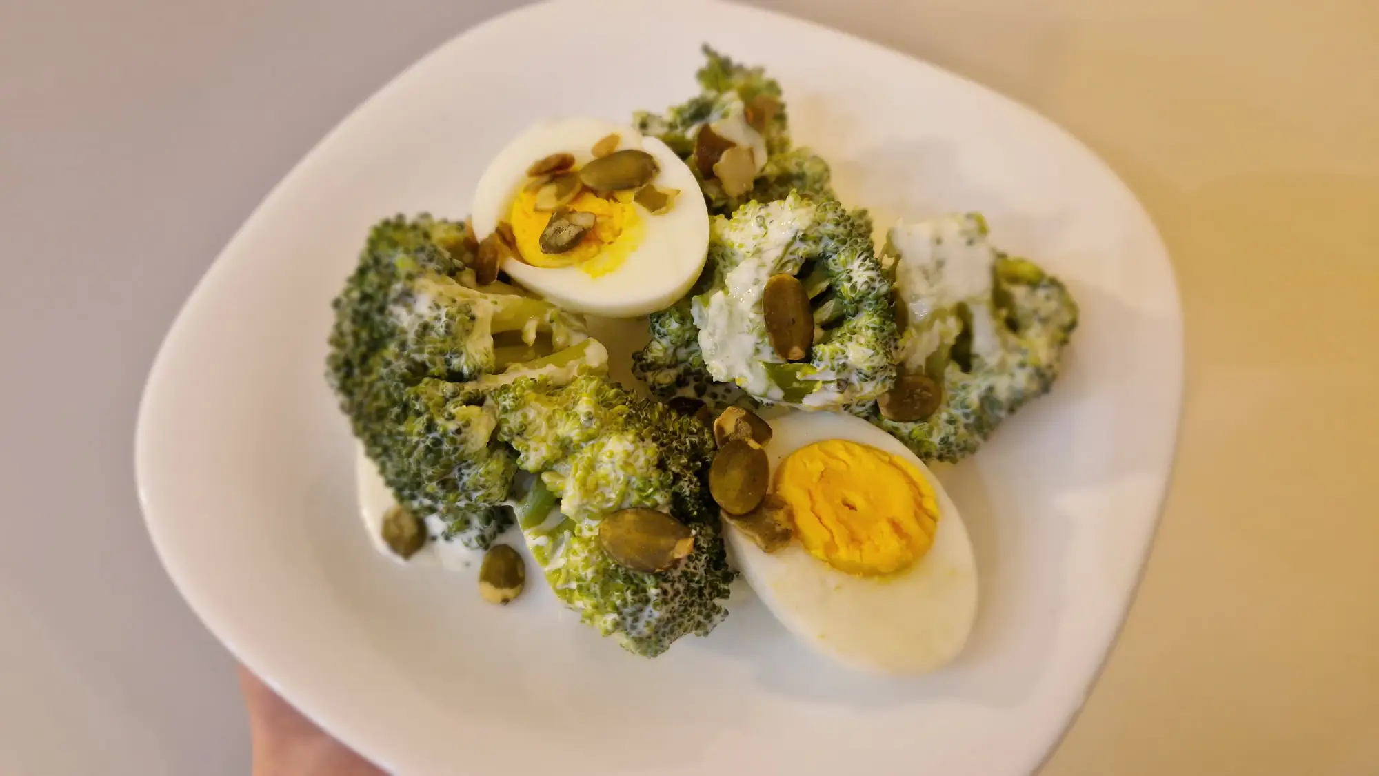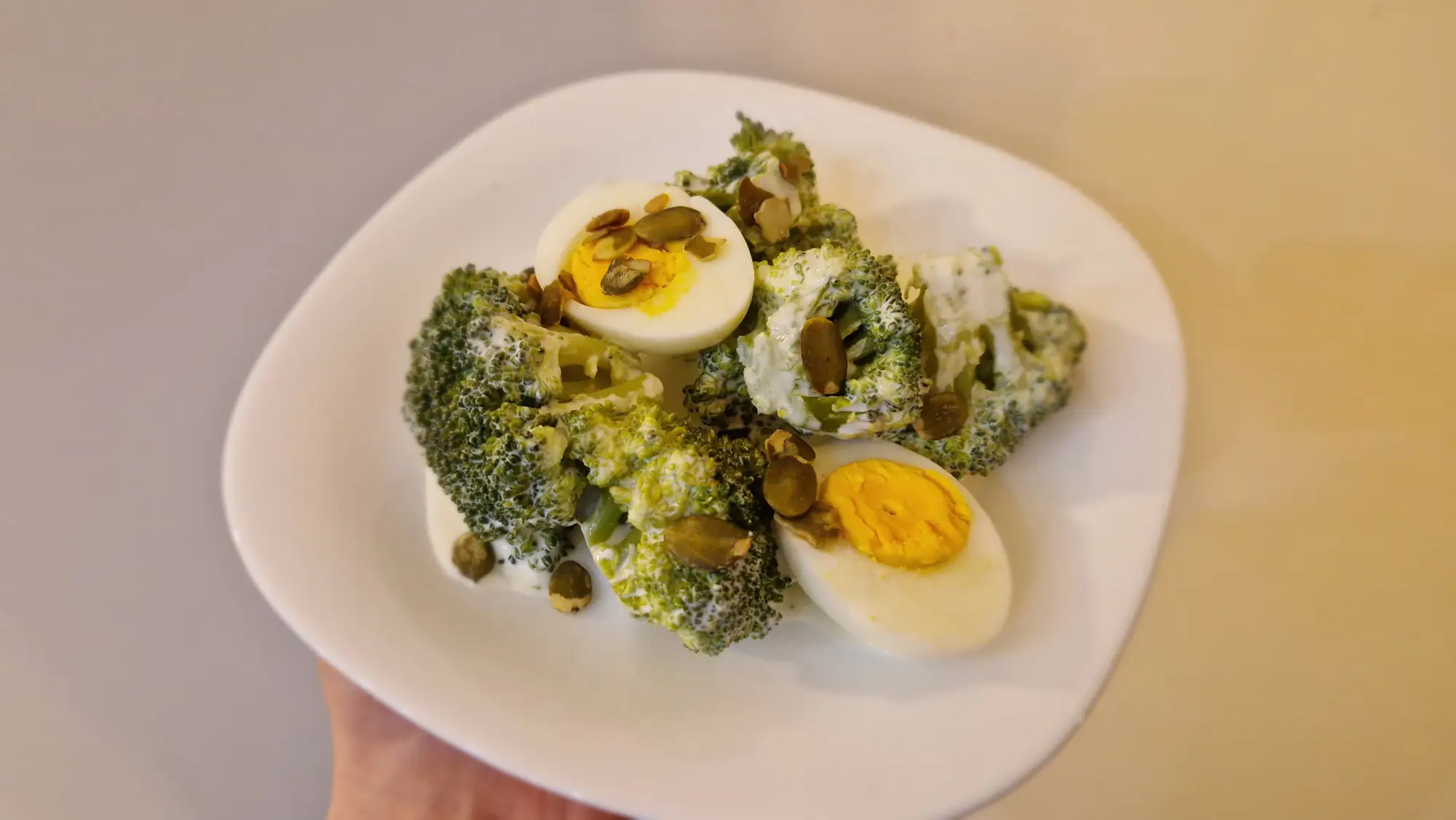 Brokuł dostarcza sporo błonnika, witaminy C oraz związków o działaniu przeciwutleniającym, które wspierają odporność i zdrowie komórek. Jajka są świetnym źródłem pełnowartościowego białka oraz witamin z grupy B i zdrowych tłuszczów, co sprzyja regeneracji organizmu i daje uczucie sytości. Dodatek jogurtu naturalnego wnosi korzystne bakterie oraz dodatkowe białko, wspierając pracę jelit. Majonez zwiększa kaloryczność i zawartość tłuszczu, ale jednocześnie poprawia smak i pomaga wchłaniać witaminy rozpuszczalne w tłuszczach. Całość stanowi sycący posiłek, który może dobrze sprawdzić się jako lekki obiad lub kolacja.