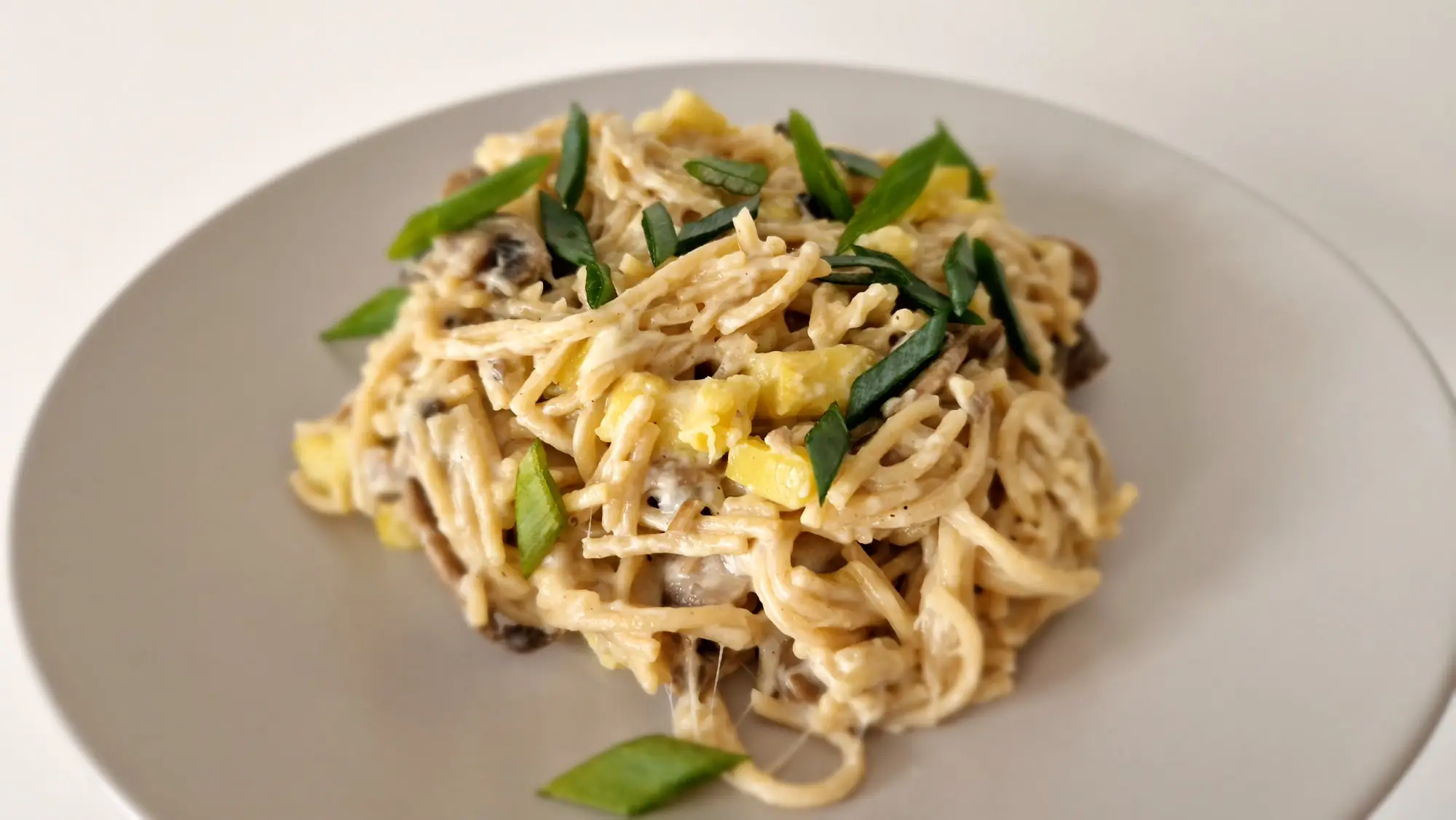 To danie z pełnoziarnistym makaronem, pieczarkami i cukinią w lekkim sosie maślano-śmietanowym to połączenie smaku i wartości odżywczych. Pełnoziarnisty makaron dostarcza złożonych węglowodanów i błonnika, który wspiera trawienie i daje uczucie sytości. Cukinia i pieczarki wzbogacają posiłek o witaminy, minerały oraz antyoksydanty, a także dodatkową porcję błonnika. Całość to zbilansowany posiłek bogaty w białko, który sprawdzi się zarówno w roli sycącego obiadu, jak i kolacji.